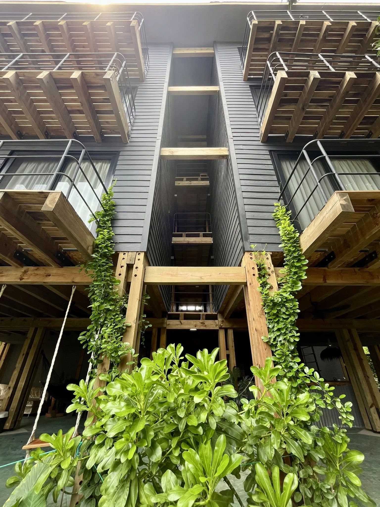 Construido con madera maciza de pino tratado y paneles de fibrocemento con núcleo de poliuretano, el edificio combina eficiencia térmica, durabilidad y confort acústico. Su esquema en cruz mejora la ventilación y la privacidad, mientras que su fachada negra con textura de madera evoca la técnica japonesa Shou Sugi Ban.